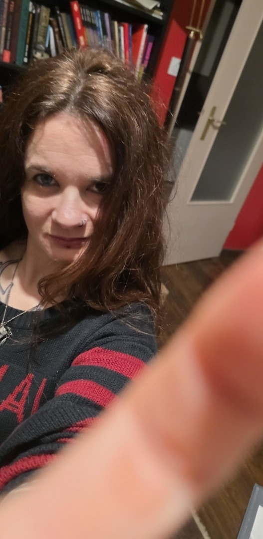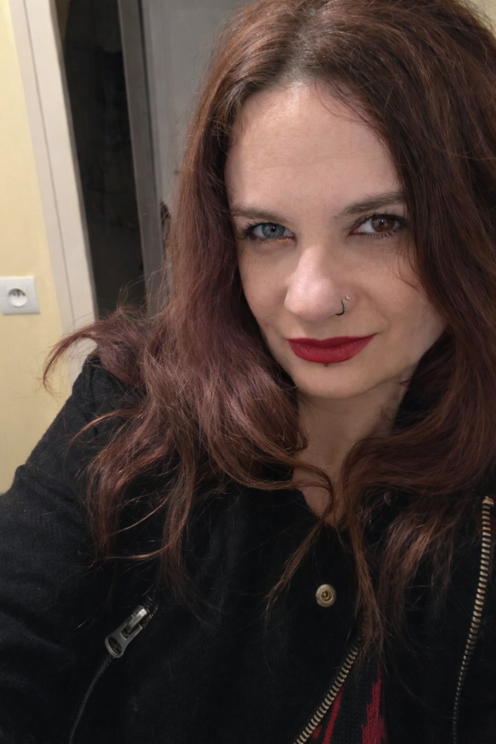 Tatouée, percée, quelques dreadlocks sous ma chevelure épaisse, cicatrices visibles, porte des lentilles de couleur (bleue et ambre , effet yeux vairons).