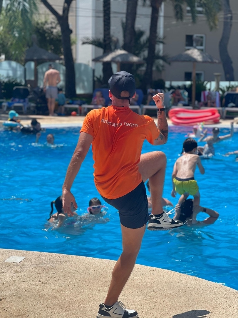 Danse devant et pour les enfants, sur scène, avec présentation au micro dans 5 langues. Spectacle de danse et chant en playback de 45 minutes, comme le Roi lion (Rafiki) ou Saturday Night Fever (Toni Manero). En fin de saison, acteur dans un Tunel d'horreur pour halloween. 03-10/2025