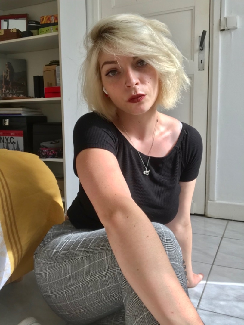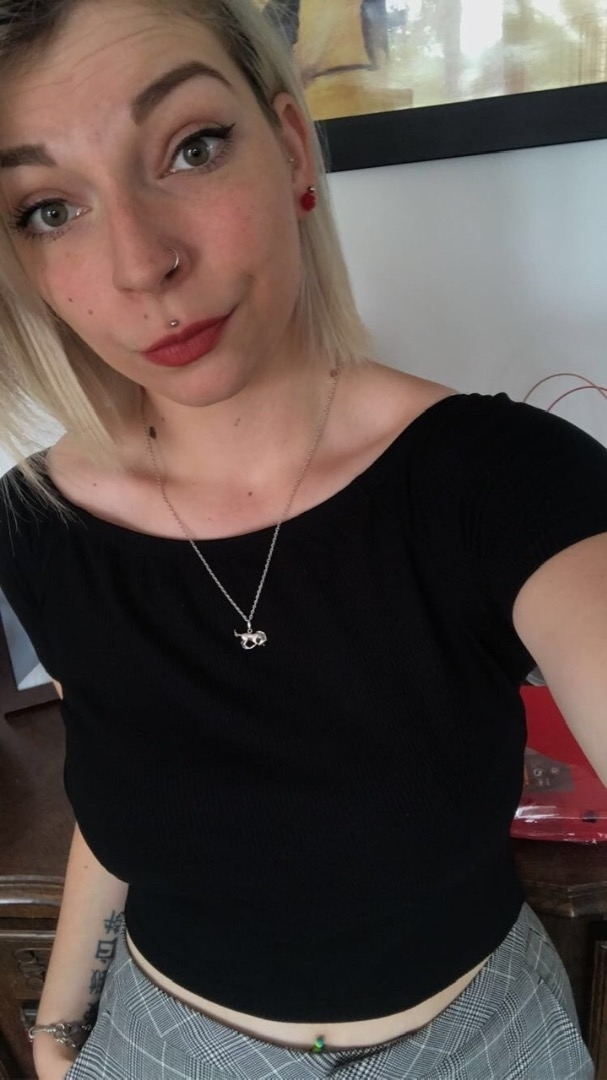 Tatouage intérieur avant bras gauche et omoplate droit, piercing nez, bouche, oreille et nombril.