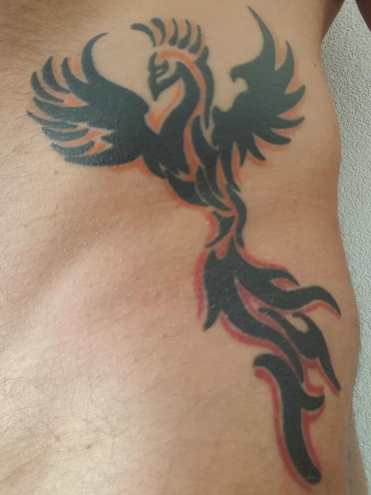 tatouage Phoenix en noir, rouge, orange et jaune sur la hanche gauche.