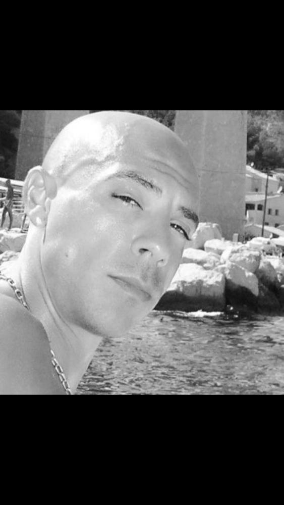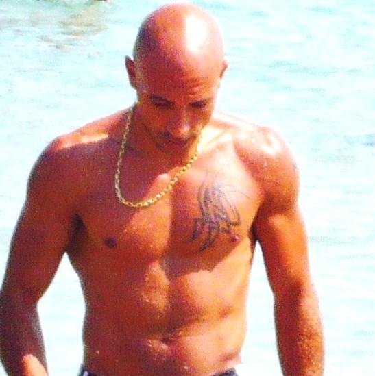 Voix grave, tête rasé, tatouage sur le pectoraux gauche et bras gauche.