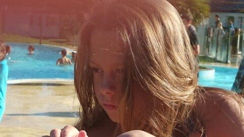 cheveux très long ,mate, yeux vert noisette. Souriante.