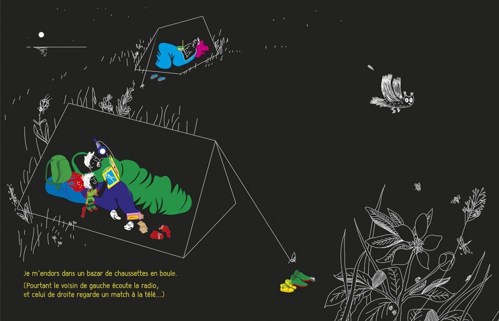 "Des chemins de campagne, un océan de triangles, des nombrils qui cuisinent à la fenêtre des caravanes : bienvenue au camping, vu par un garçonnet en vacances avec son père. Les nouveaux amis, le voisin qui écoute la radio, l’impression d’être allongé sous un chapeau… Et puis le réveil entortillé dans le sac de couchage, les chaussures pleines de pluie, les bêtes qui piquent les fesses et celles qui chipent la confiture : que des bons souvenirs!"
