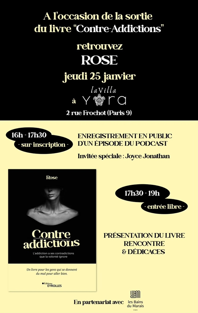 A l'occasion de la sortie de “Contre-Addictions” le 25 janvier, Rose vous donne rendez-vous à La Villa Yora pour un évènement inédit. Dans ce sublime et chaleureux restaurant, venez à sa rencontre et assister à l’enregistrement d’un épisode de son podcast avec la chanteuse Joyce Jonathan.