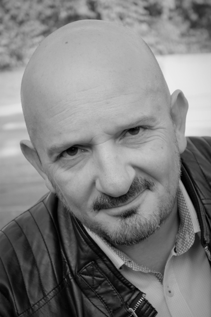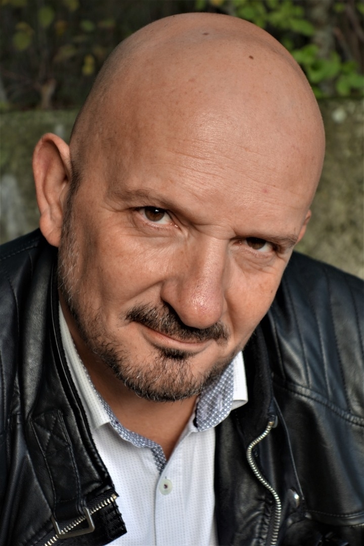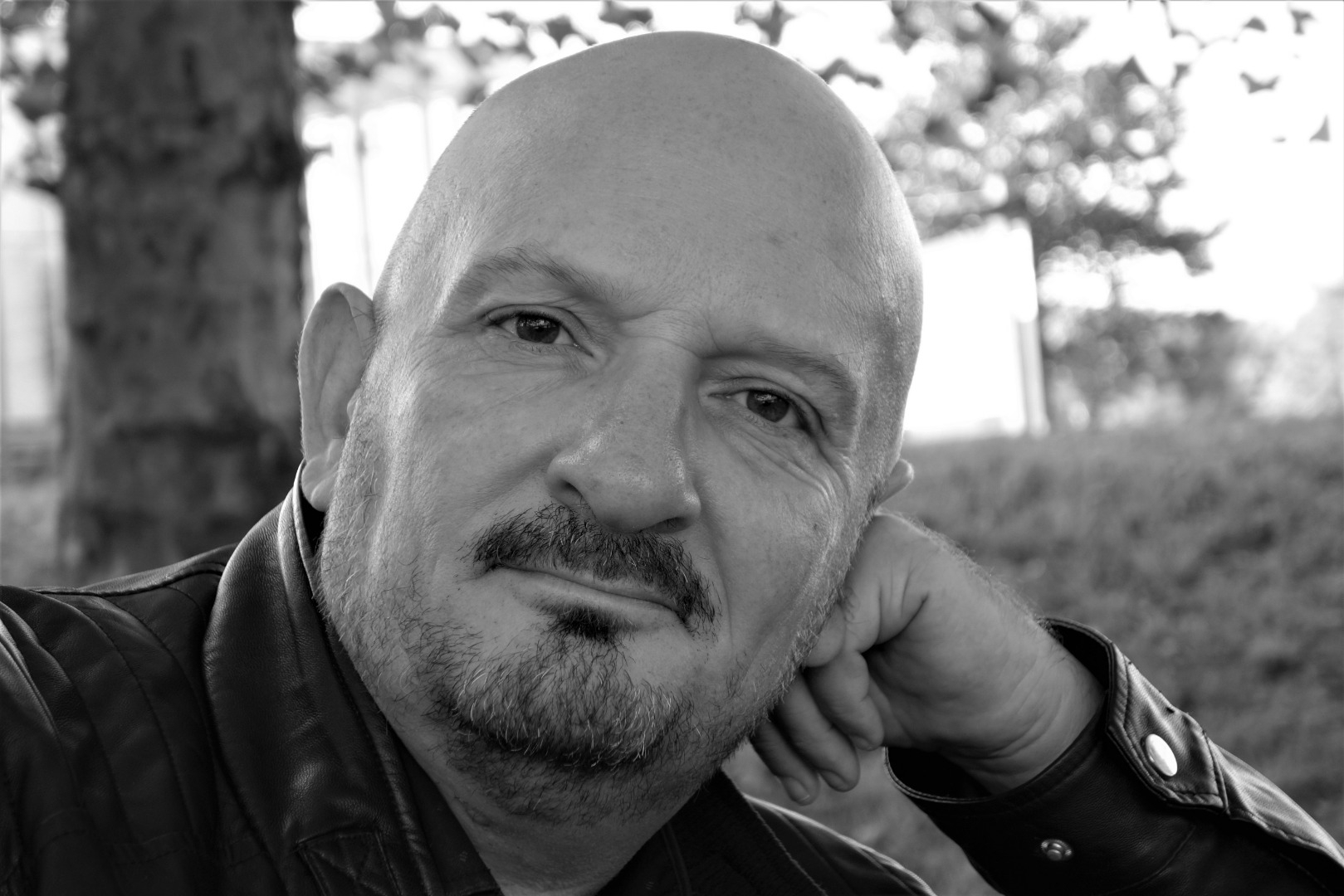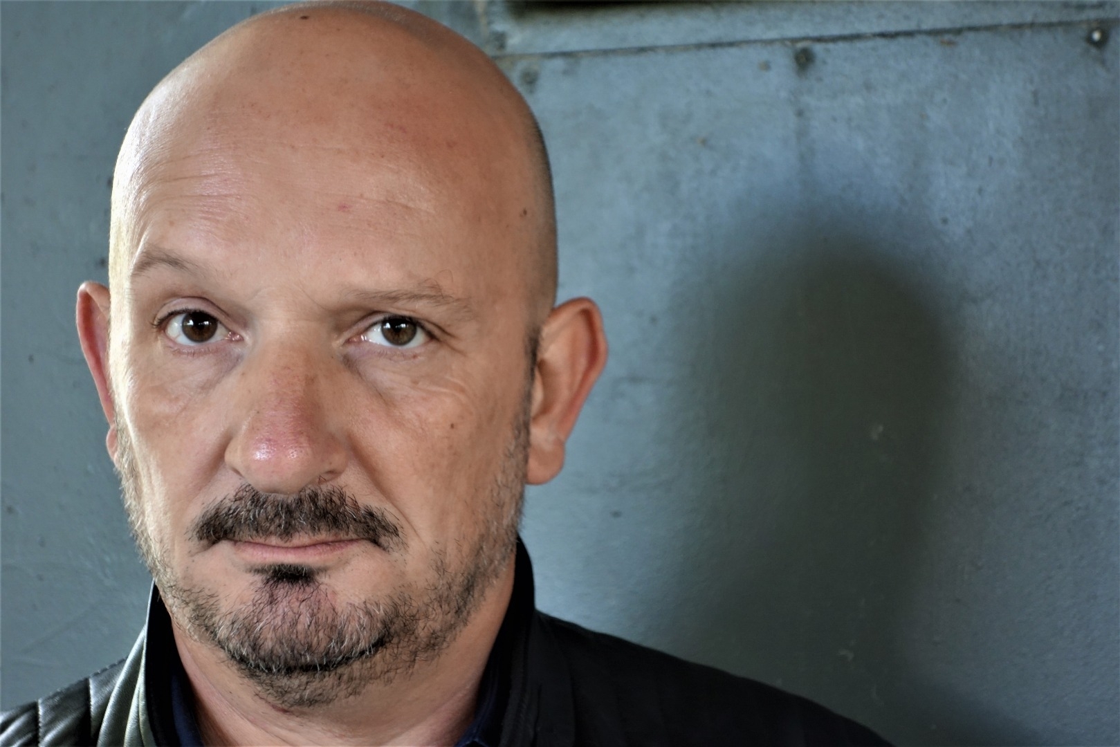 Chauve. Barbe légére poivre et sel.