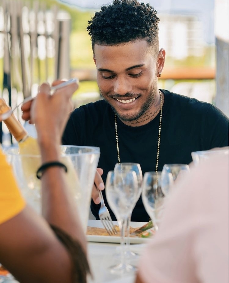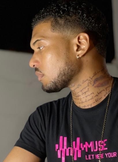 Tatouages (cou, bras gauche, torse, cotes) et piercings (oreilles)