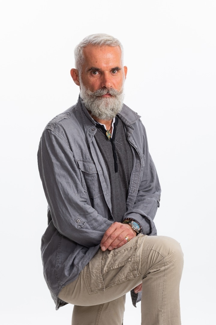 barbe longue et moustache poivre et sel , cheuveux fins blancs, sourcils bruns.